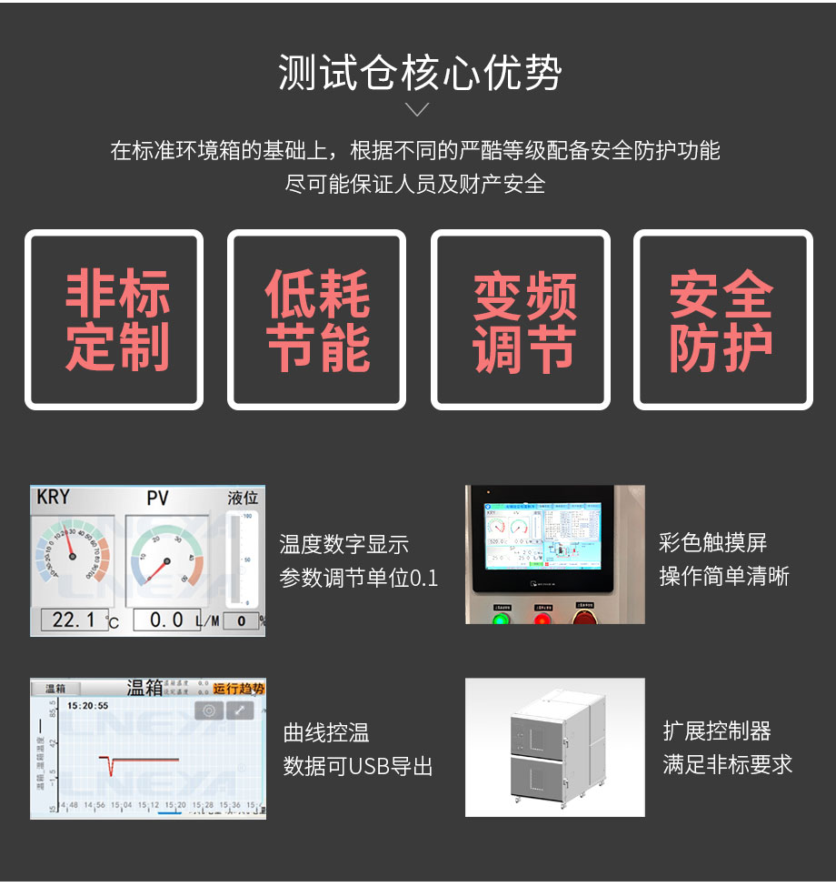 步入式環境試驗箱 2024年7月4日 694 本試驗箱適用于整機或大型零部件的低溫、高溫、高低溫變化、恒定濕熱、高低溫交變濕熱等試驗。可根據用戶要求改變工作室尺寸與功能,采用拼塊式箱體,造型美觀大方,科學的風道設計,能滿足不同客戶的需求。;變頻自定算法控制,機組運行綜合節能35%以上... 查看全文