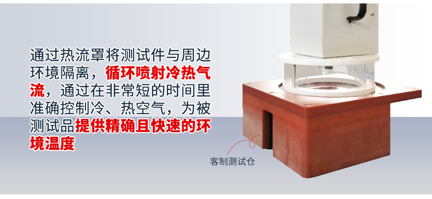 1、試驗機輸出氣流罩將被測試品罩住,形成一個較密閉空間的測試腔,試驗機輸出的高溫或低溫氣流,使被測試品表面溫度發生劇烈變化,從而完成相應的高低溫沖擊試驗;